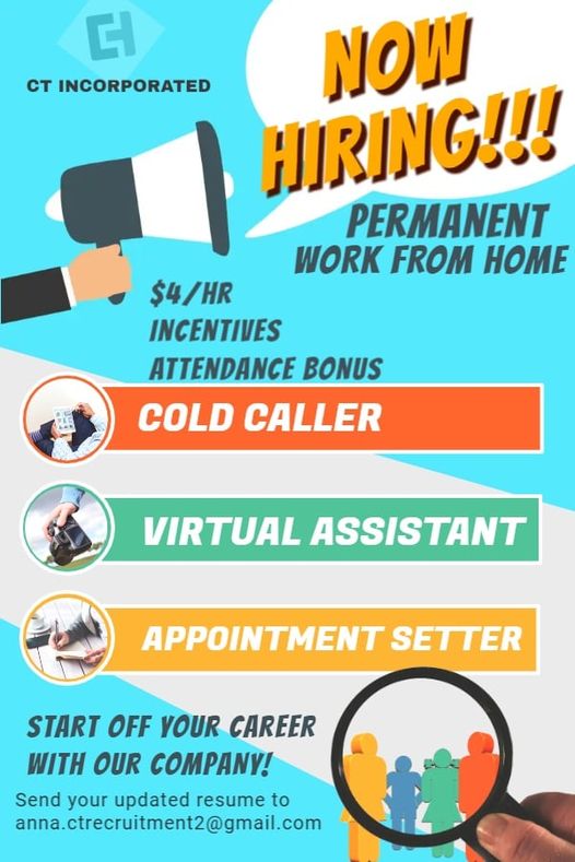 January 21, 2024PTPA:WE ARE HIRING WORK FROM HOME READY TO START ASAP!! ACCOUNT: REAL ESTATE COMPANY: CT INCORPORATED AVAILABLE POSITIONS: APPOINMENT SETTER…
