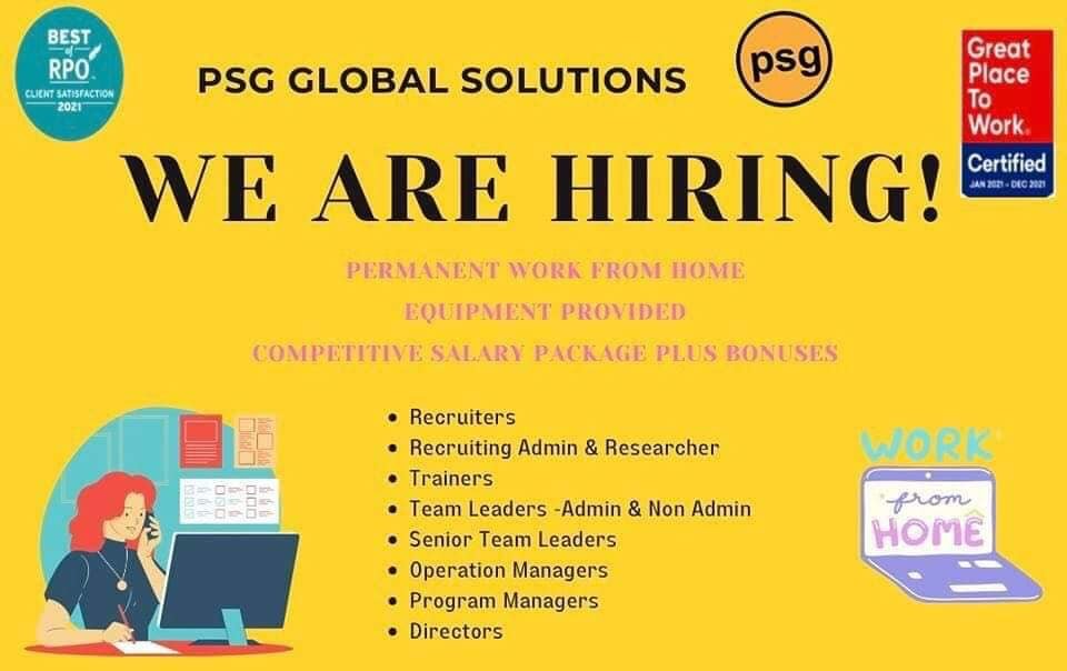 URGENT HIRING!!! PSG Global Solutions Inc. (RPO) WORK FOM HOME FROM TRAINING TO …